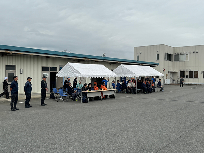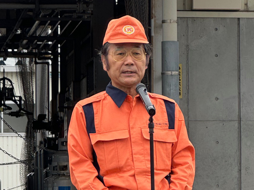 訓練開始に先立ち、髙橋協会長は「災害はいつ発生するかわからない。地震だけでなく台風・豪雨にも備える必要がある。地域や県民のために尽力を継続していただきようお願いしたい」と述べ、続いて室越副協会長は「災害発生時には、被災者の役に立てるよう中核充てん所が円滑に活動できるようにしておく必要がある。有事に備えての訓練は重要であり、しっかり機能できるように万全の備えをしたい」と中核充てん所の存在意義を強調しました。(株)エネアーク関東前原社長は「自然災害が多発している昨今、中核充てん所の役割はますます重要になっている。本日は日頃積み重ねてきた成果を披露したい」と述べました。
