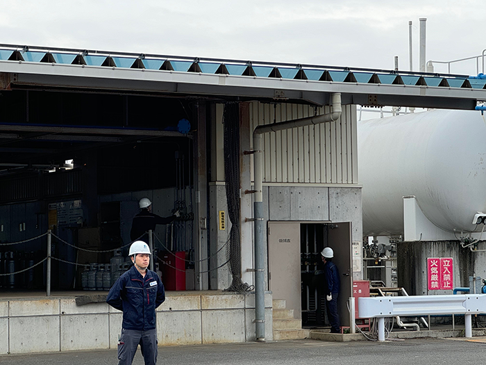 訓練は、震度6の地震が発生したという想定の下、非常用電源の確保、充てん機能の確認と再稼働の実施。代替供給訓練は、病院など優先施設へのガス供給を途絶えさせないため代替供給を受け入れるというもの。配送車の誘導、容器への共通バーコードの貼り付け、代替充てんを行いました。最後に隣接設備の火災延焼のリスクに備え、タンクへの散水訓練を実施しました。
